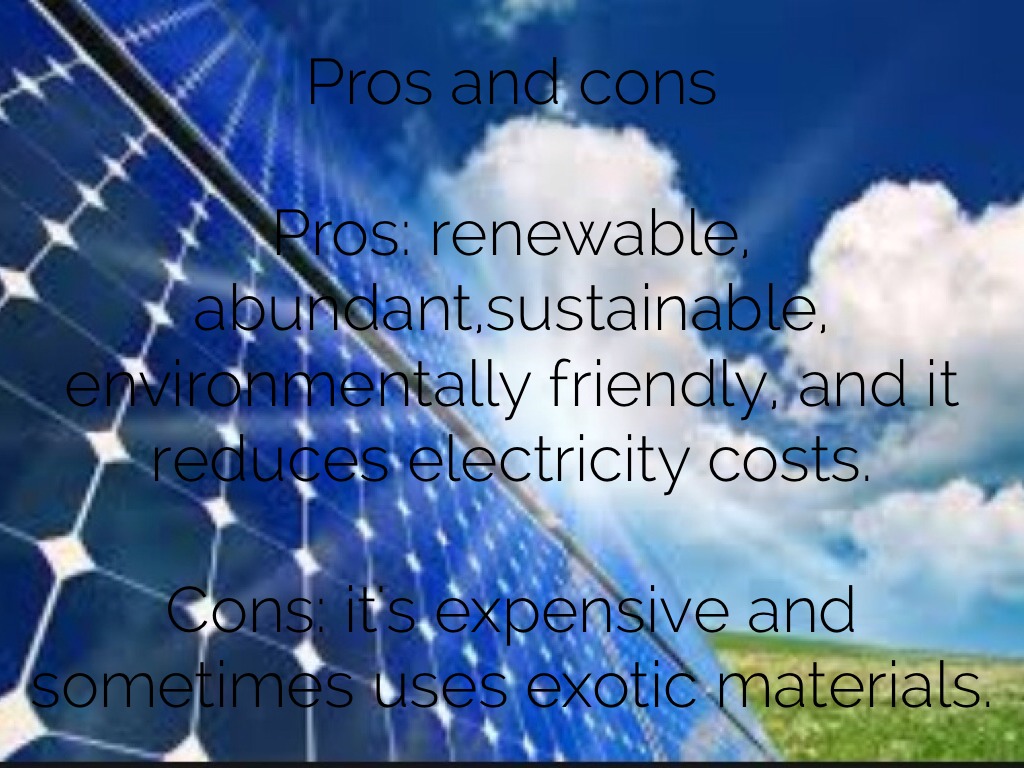 Pros: renewable, abundant,sustainable, environmentally friendly, and it reduces electricity costs.