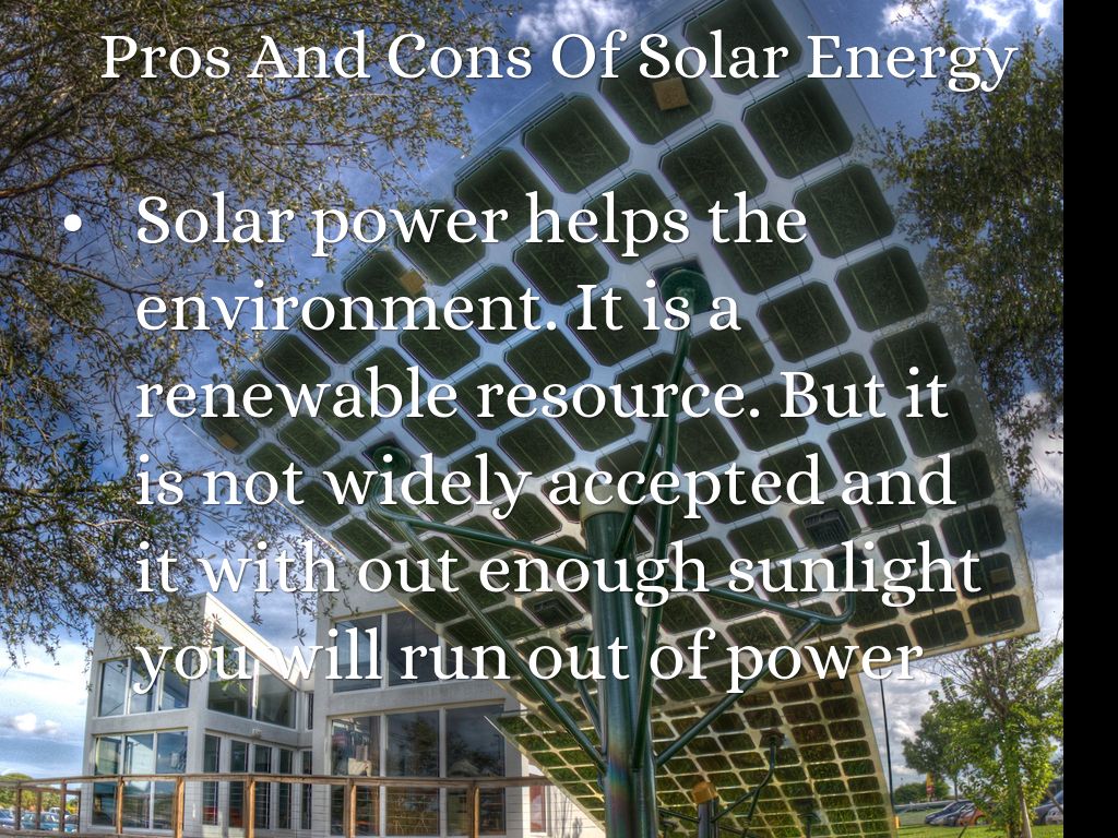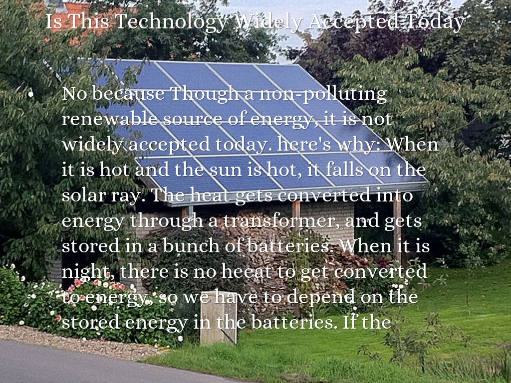 No because Though a non-polluting renewable source of energy, it is not widely accepted today. here's why: When it is hot and the sun is hot, it falls on the solar ray. The heat gets converted into energy through a transformer, and gets stored in a bunch of batteries. When it is night, there is no heeat to get converted to energy, so we have to depend on the stored energy in the batteries. If the energy in the batteries run out, we won't have electricity till the sun comes out again. This goes for cars, and homes.