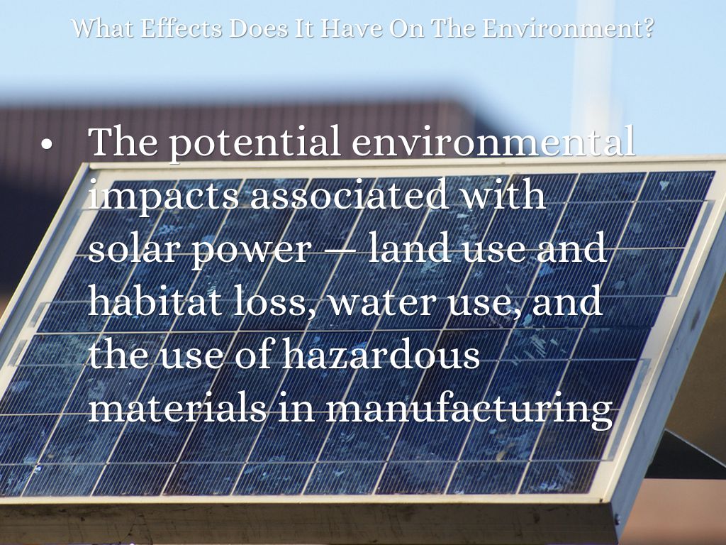 The potential environmental impacts associated with solar power — land use and habitat loss, water use, and the use of hazardous materials in manufacturing
