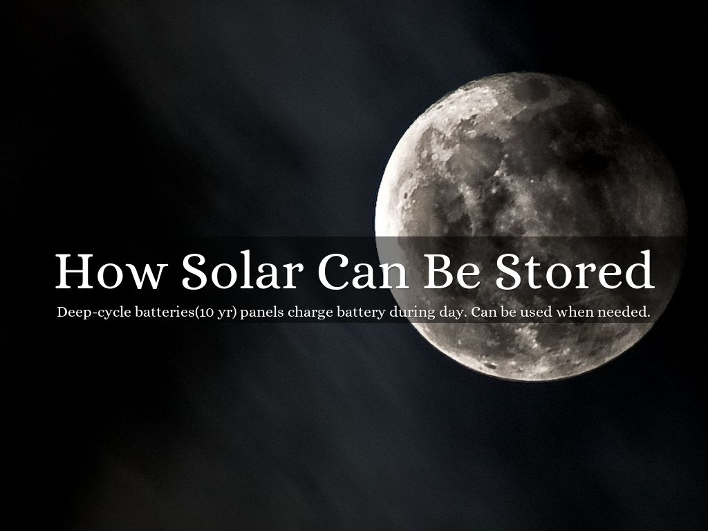 Deep-cycle batteries(10 yr) panels charge battery during day. Can be used when needed.