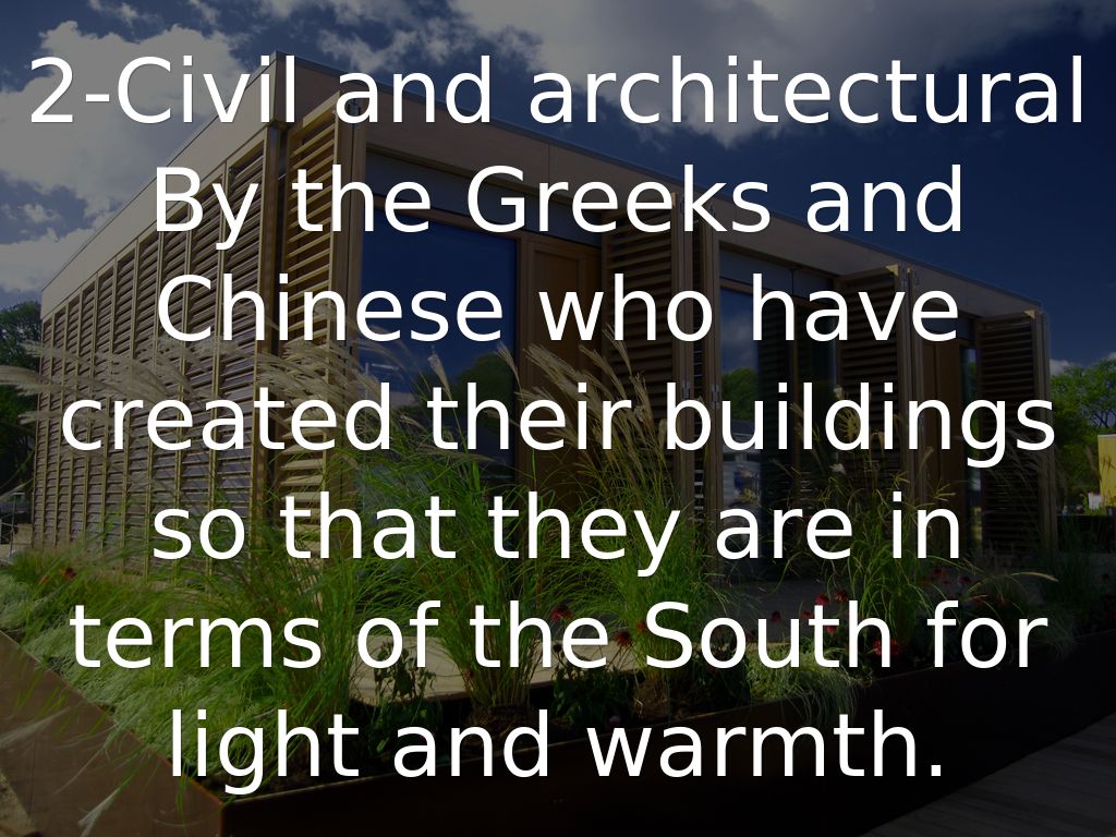 2-Civil and architectural By the Greeks and Chinese who have created their buildings so that they are in terms of the South for light and warmth.