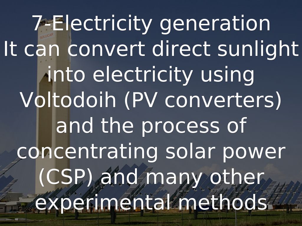 It can convert direct sunlight into electricity using Voltodoih (PV converters) and the process of concentrating solar power (CSP) and many other experimental methods