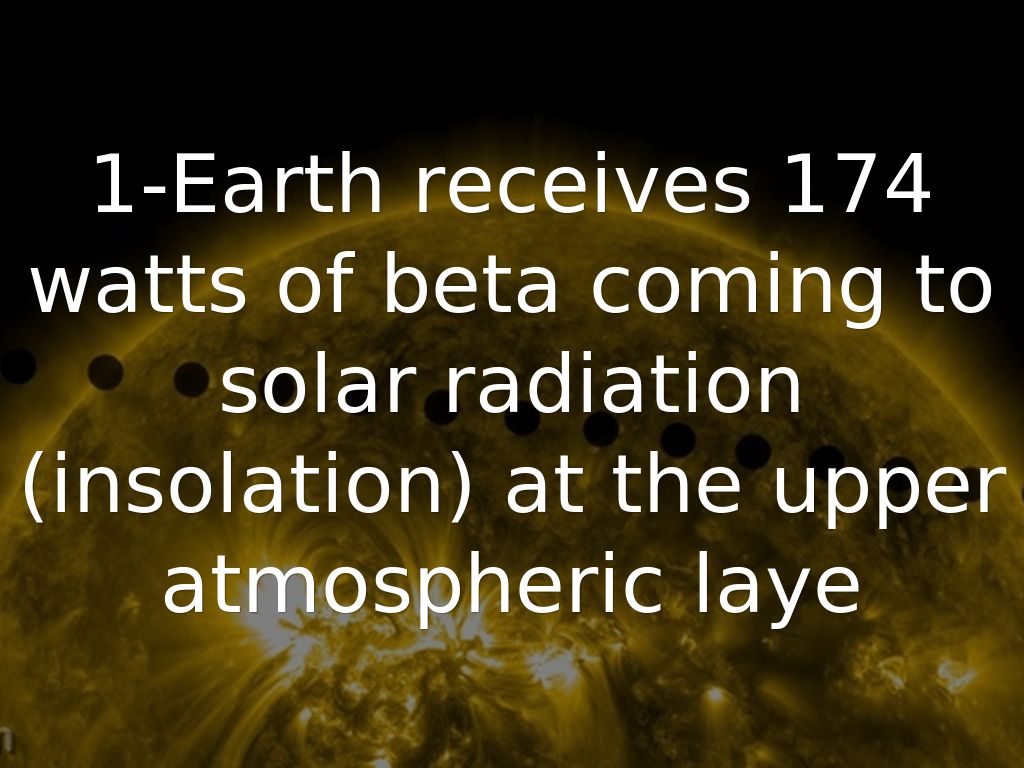 1-Earth receives 174 watts of beta coming to solar radiation (insolation) at the upper atmospheric laye