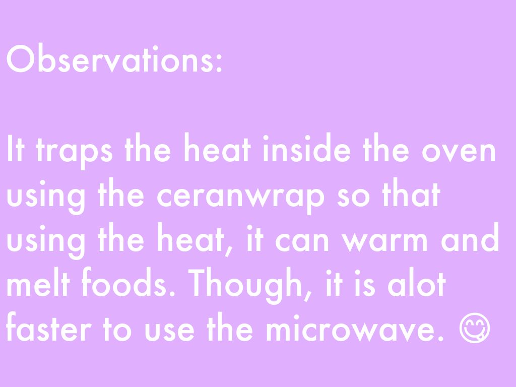 It traps the heat inside the oven using the ceranwrap so that using the heat, it can warm and melt foods. Though, it is alot faster to use the microwave. 😋