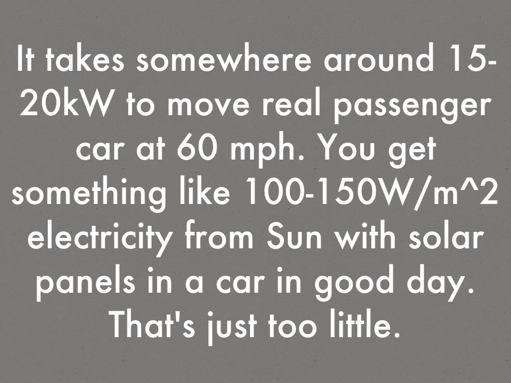 It takes somewhere around 15-20kW to move real passenger car at 60 mph. You get something like 100-150W/m^2 electricity from Sun with solar panels in a car in good day. That's just too little.
