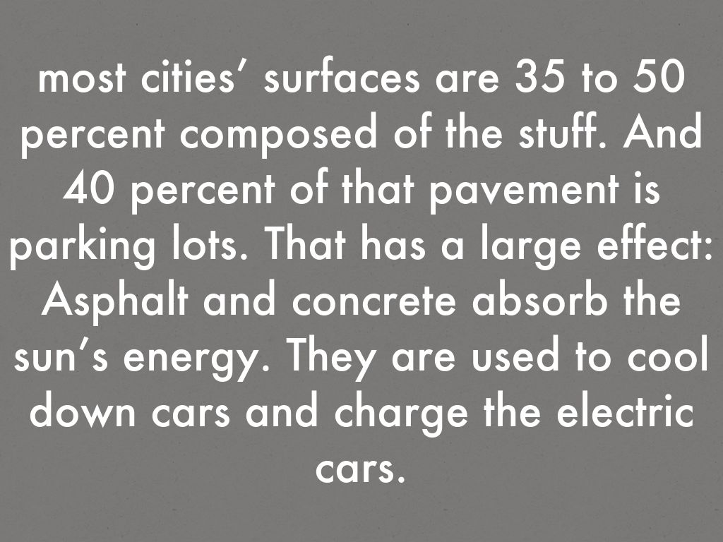 most cities’ surfaces are 35 to 50 percent composed of the stuff. And 40 percent of that pavement is parking lots. That has a large effect: Asphalt and concrete absorb the sun’s energy. They are used to cool down cars and charge the electric cars.