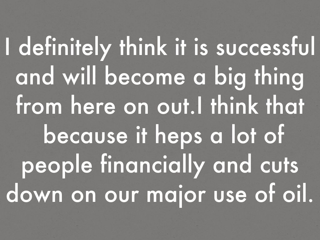 I definitely think it is successful and will become a big thing from here on out.I think that because it heps a lot of people financially and cuts down on our major use of oil.