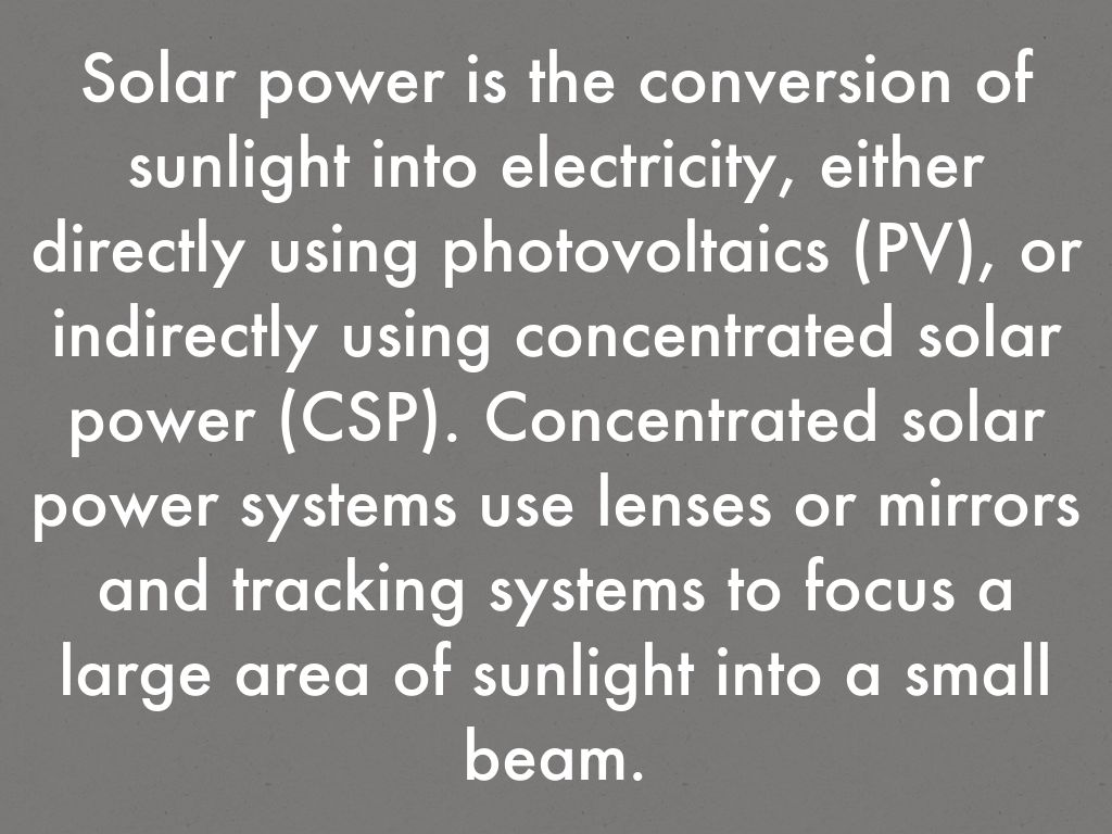 Solar power is the conversion of sunlight into electricity, either directly using photovoltaics (PV), or indirectly using concentrated solar power (CSP). Concentrated solar power systems use lenses or mirrors and tracking systems to focus a large area of sunlight into a small beam.
