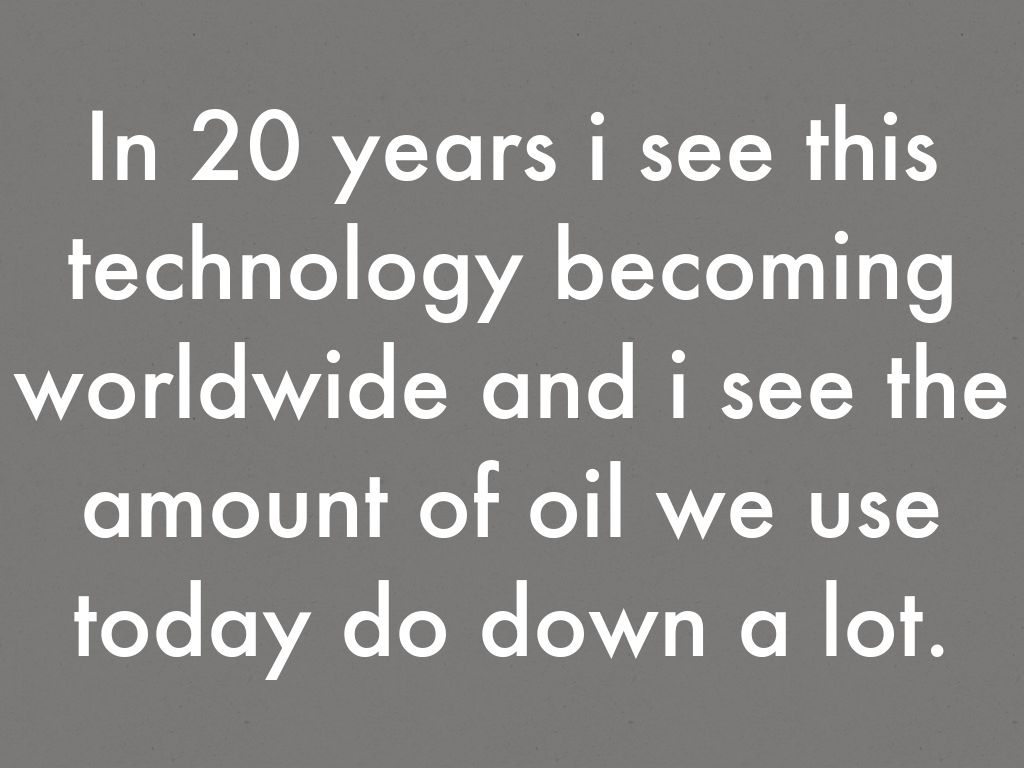 In 20 years i see this technology becoming worldwide and i see the amount of oil we use today do down a lot.