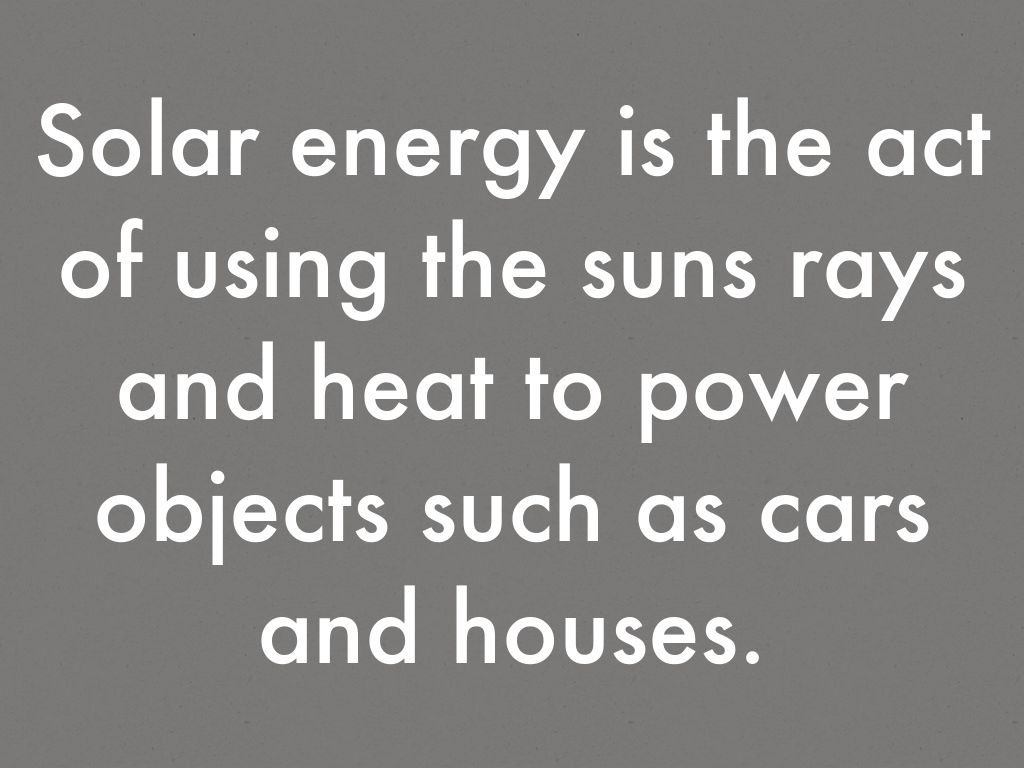Solar energy is the act of using the suns rays and heat to power objects such as cars and houses.
