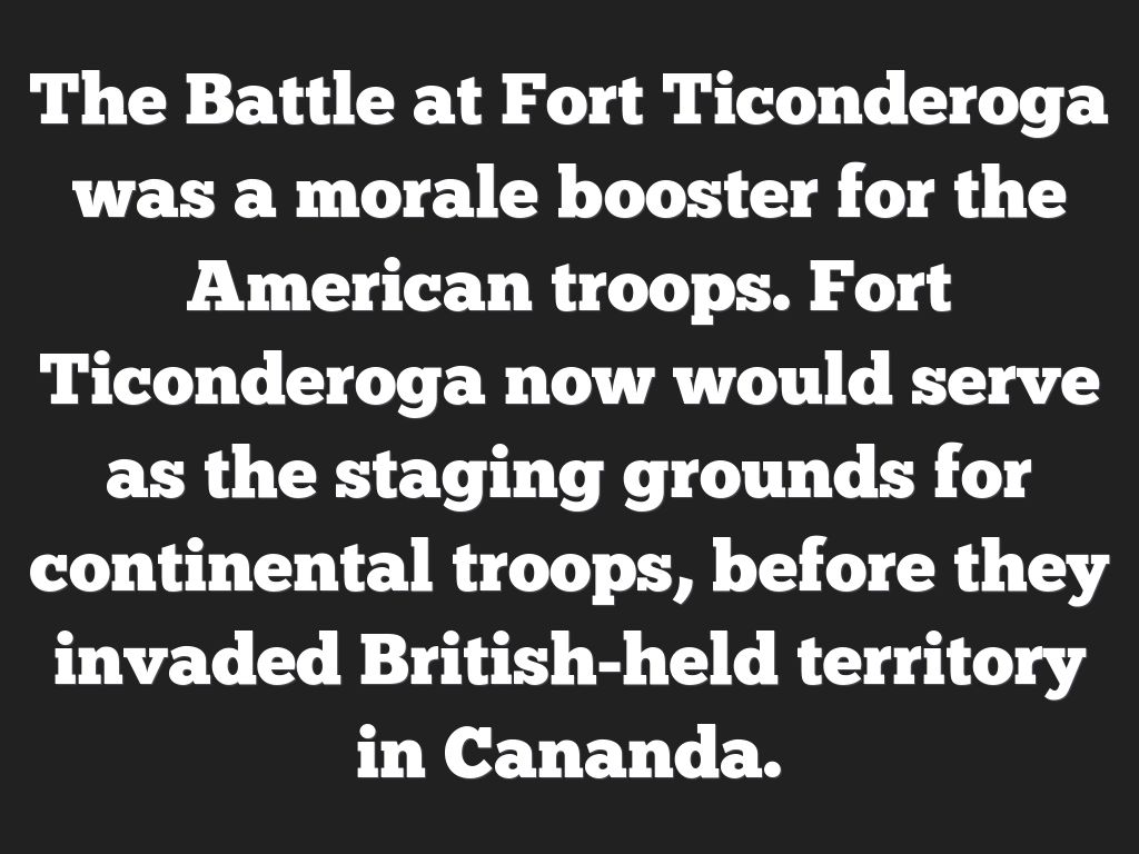 The Battle at Fort Ticonderoga was a morale booster for the American troops. Fort Ticonderoga now would serve as the staging grounds for continental troops, before they invaded British-held territory in Cananda.