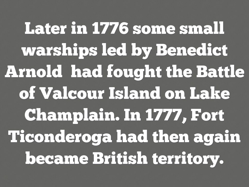 Later in 1776 some small warships led by Benedict Arnold had fought the Battle of Valcour Island on Lake Champlain. In 1777, Fort Ticonderoga had then again became British territory.