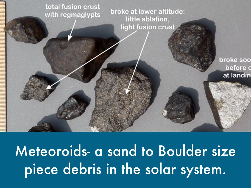 Meteoroids- a sand to Boulder size piece debris in the solar system.