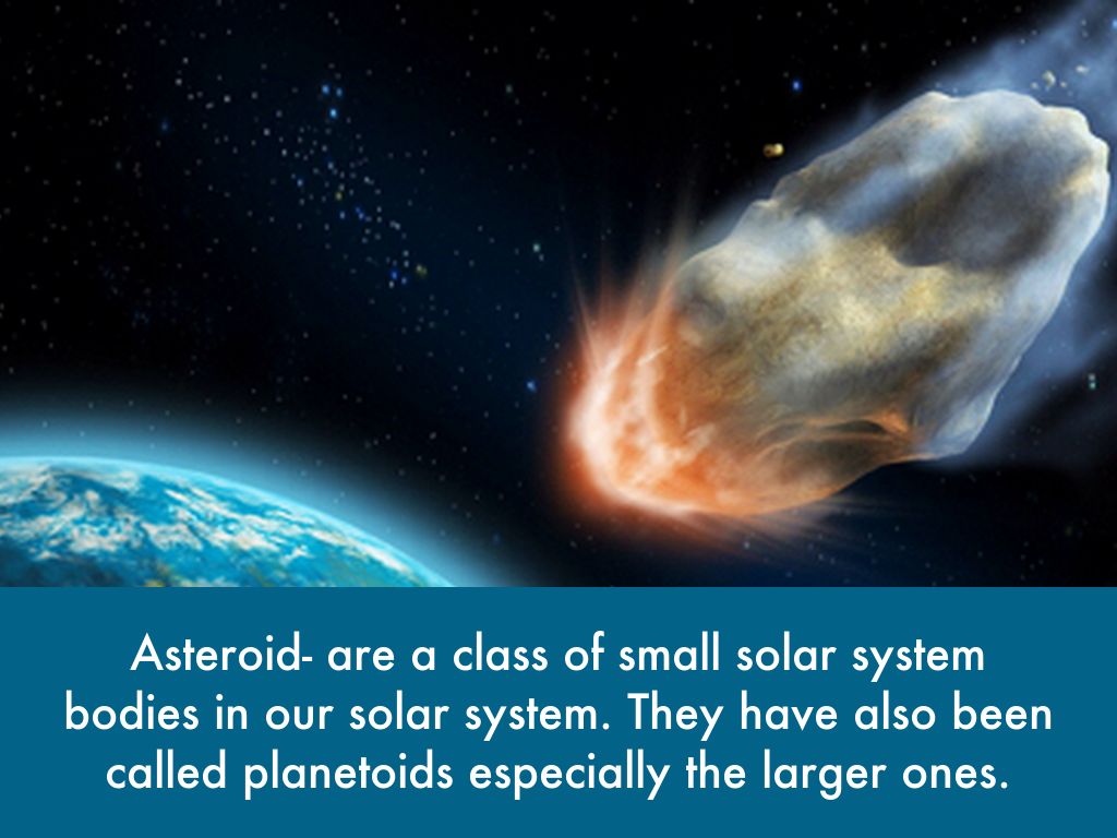 Asteroid- are a class of small solar system bodies in our solar system. They have also been called planetoids especially the larger ones.