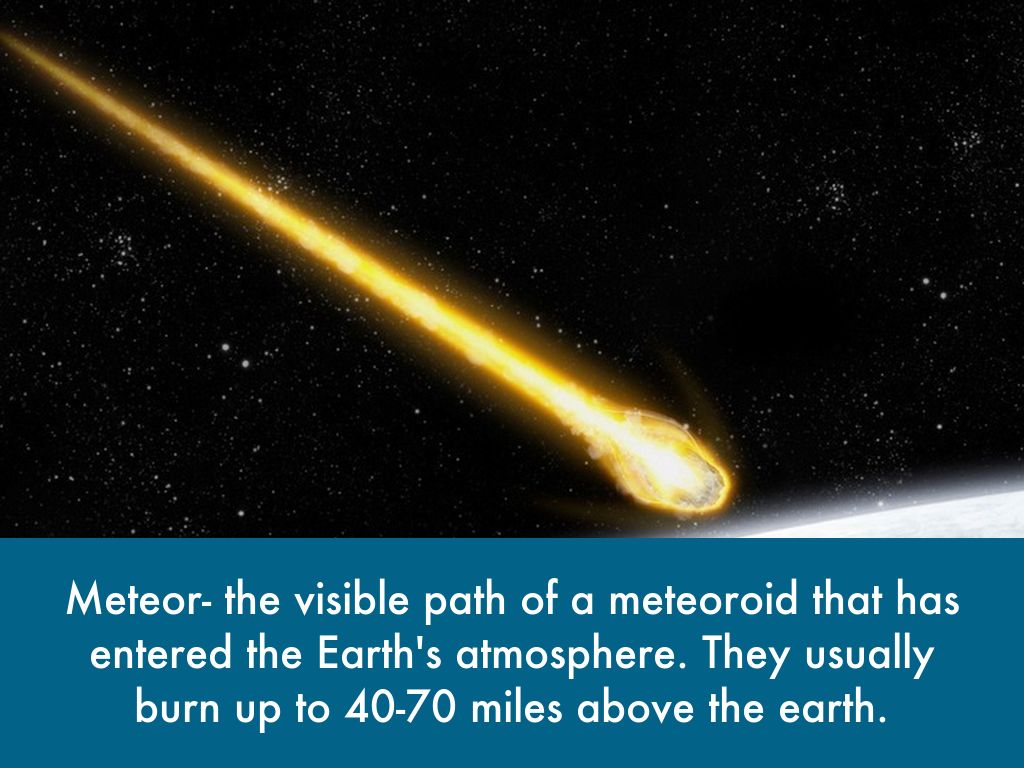 Meteor- the visible path of a meteoroid that has entered the Earth's atmosphere. They usually burn up to 40-70 miles above the earth.