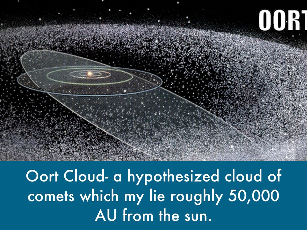 Oort Cloud- a hypothesized cloud of comets which my lie roughly 50,000 AU from the sun.