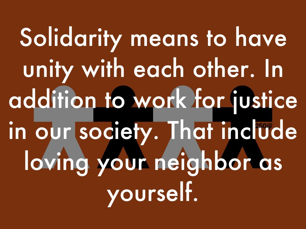 Solidarity means to have unity with each other. In addition to work for justice in our society. That include loving your neighbor as yourself.