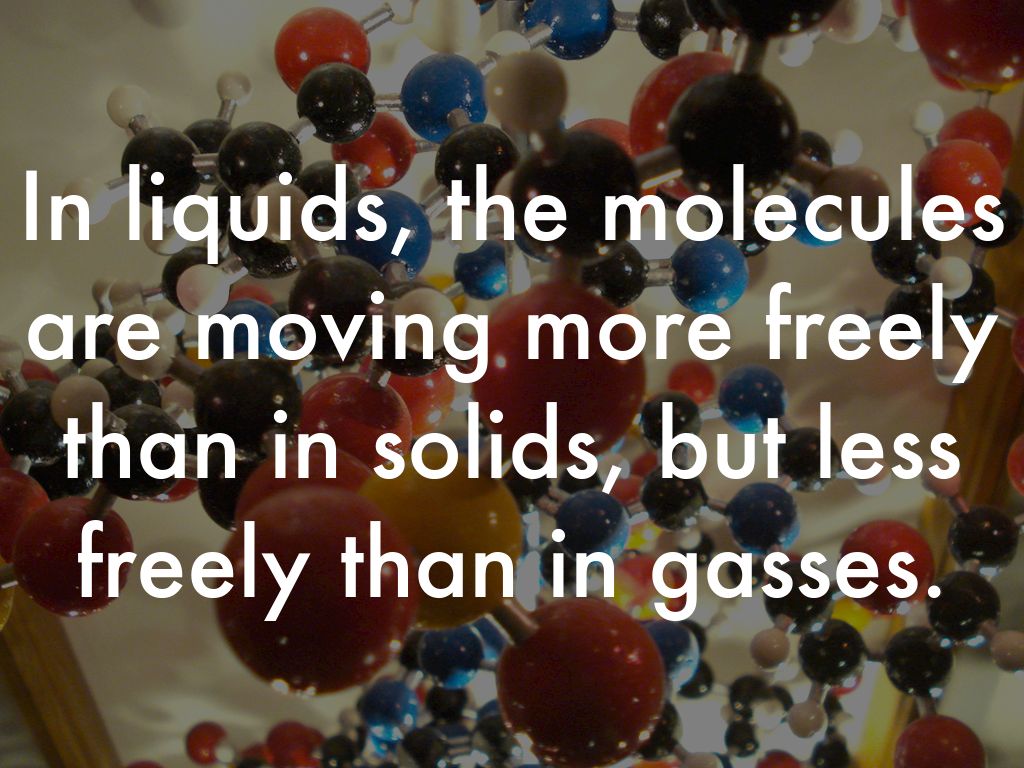 In liquids, the molecules are moving more freely than in solids, but less freely than in gasses.