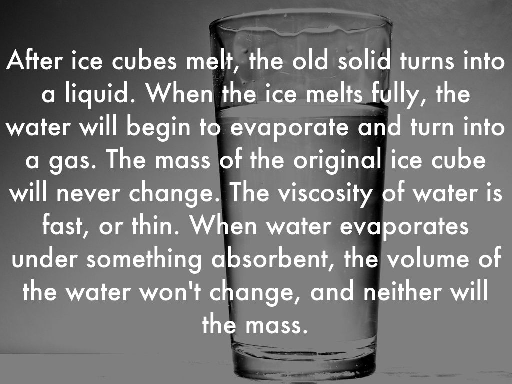 After ice cubes melt, the old solid turns into a liquid. When the ice melts fully, the water will begin to evaporate and turn into a gas. The mass of the original ice cube will never change. The viscosity of water is fast, or thin. When water evaporates under something absorbent, the volume of the water won't change, and neither will the mass.