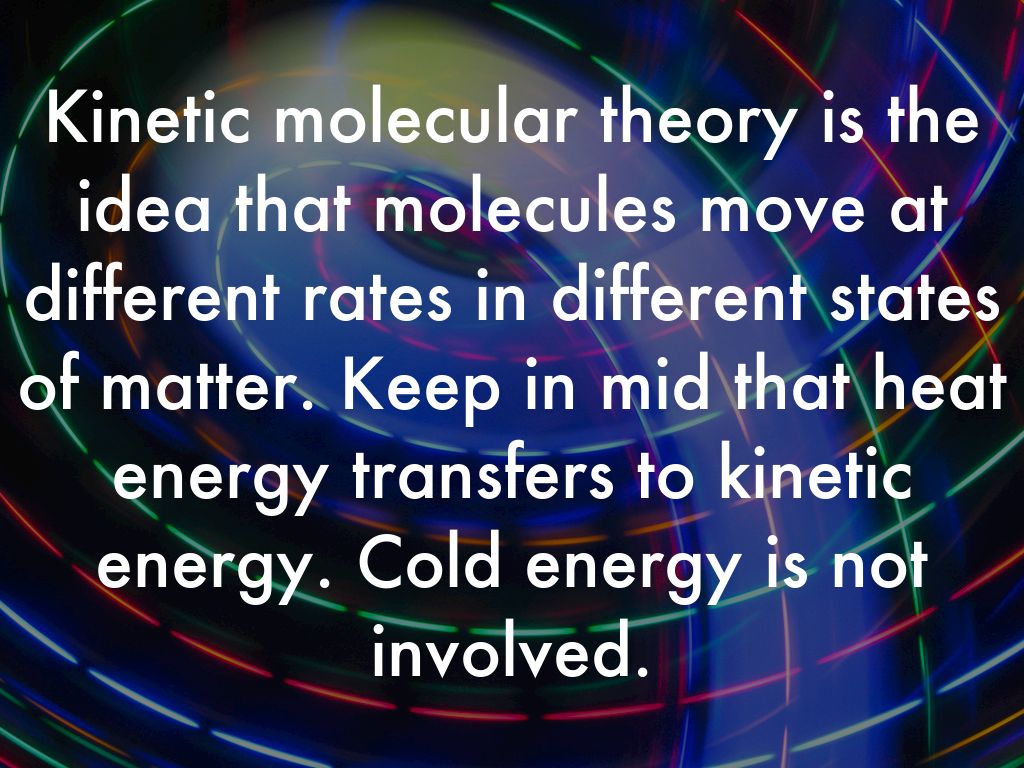 Kinetic molecular theory is the idea that molecules move at different rates in different states of matter. Keep in mid that heat energy transfers to kinetic energy. Cold energy is not involved.