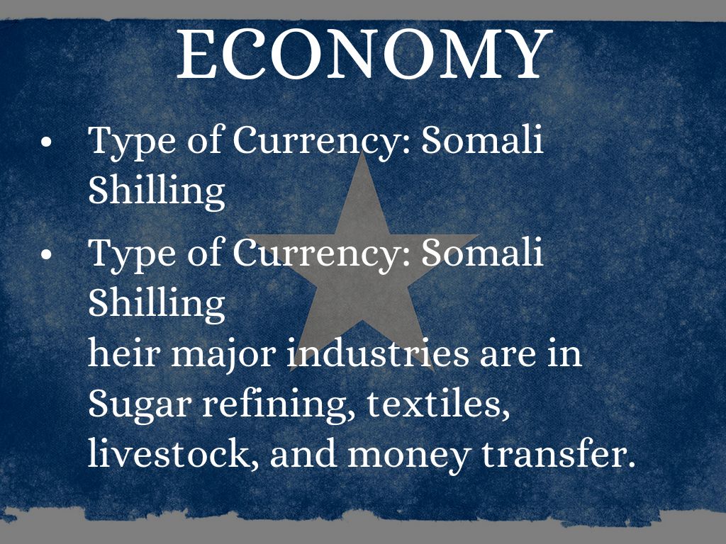 • Type of Currency: Somali Shilling heir major industries are in Sugar refining, textiles, livestock, and money transfer.
