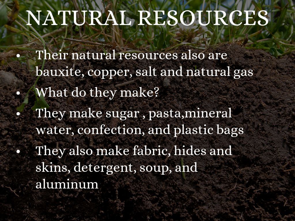 • Their natural resources also are bauxite, copper, salt and natural gas