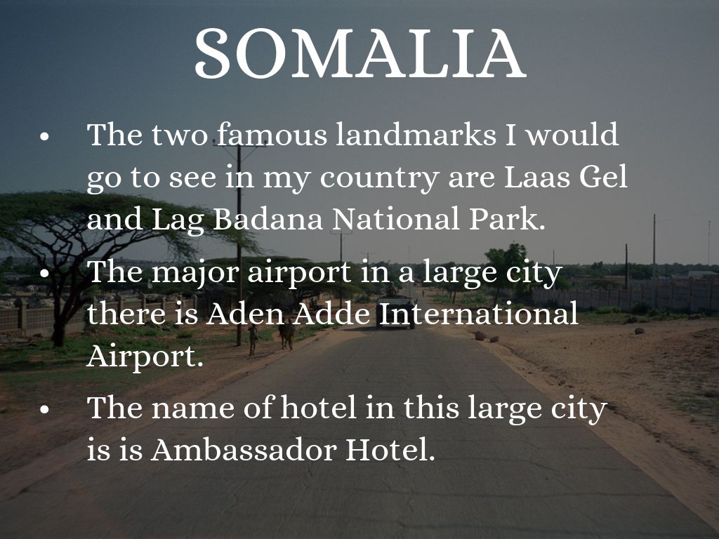 • The two famous landmarks I would go to see in my country are Laas Gel and Lag Badana National Park.
