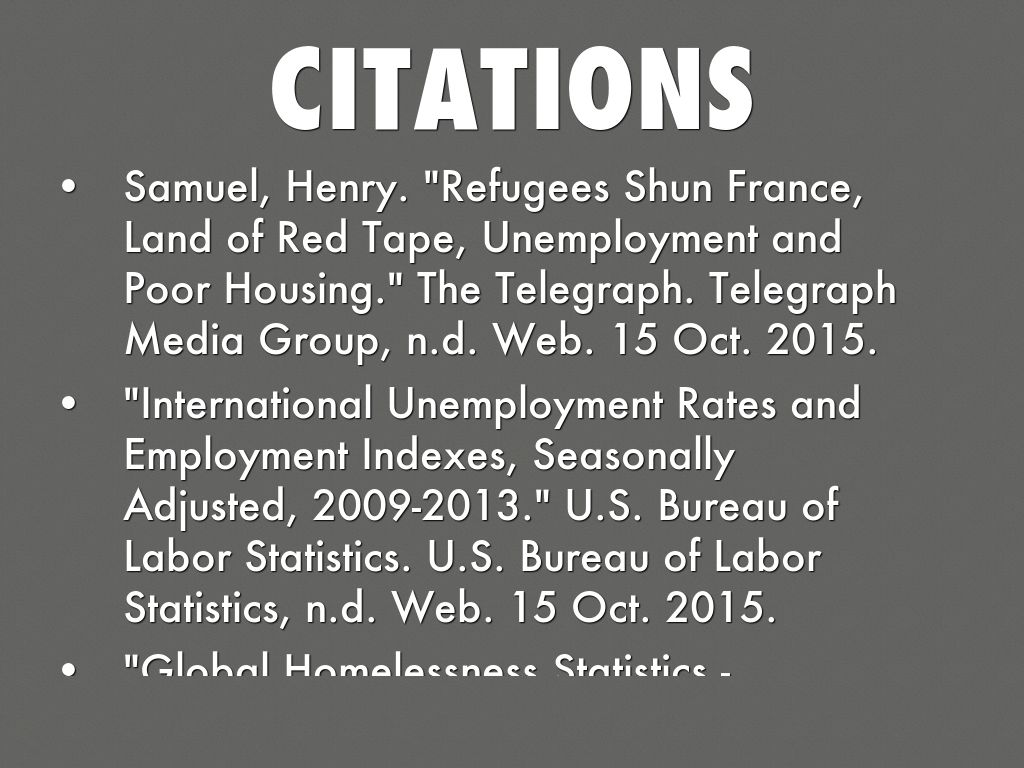 Samuel, Henry. "Refugees Shun France, Land of Red Tape, Unemployment and Poor Housing." The Telegraph. Telegraph Media Group, n.d. Web. 15 Oct. 2015.