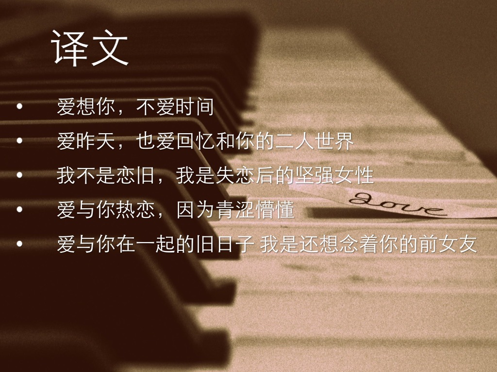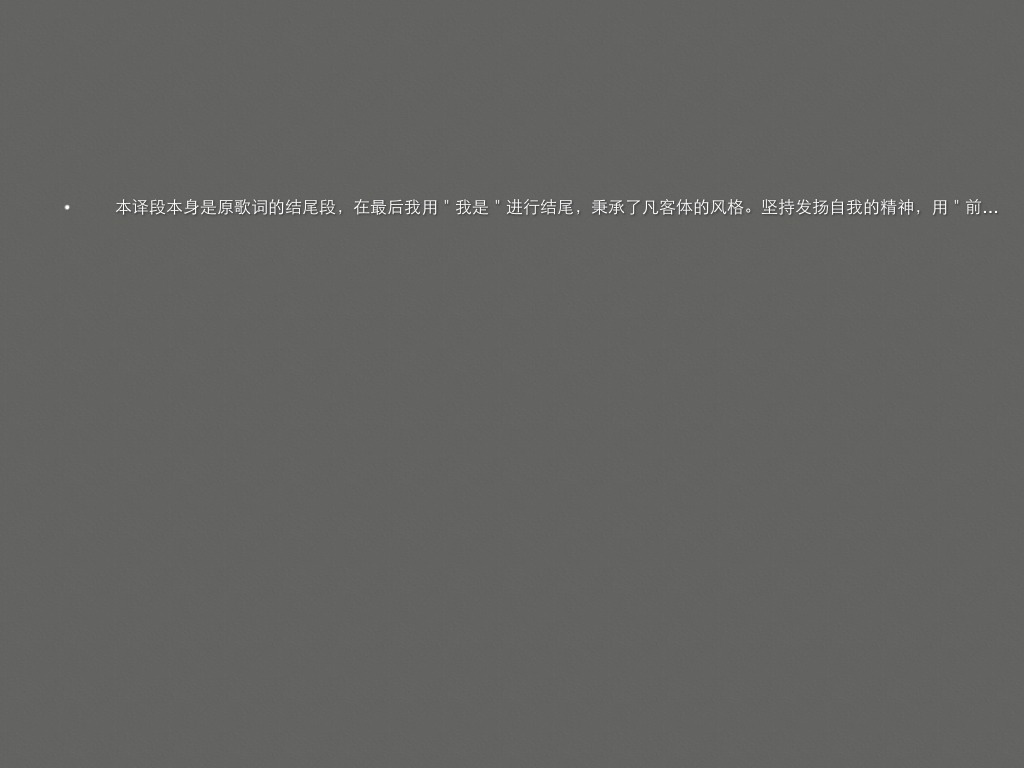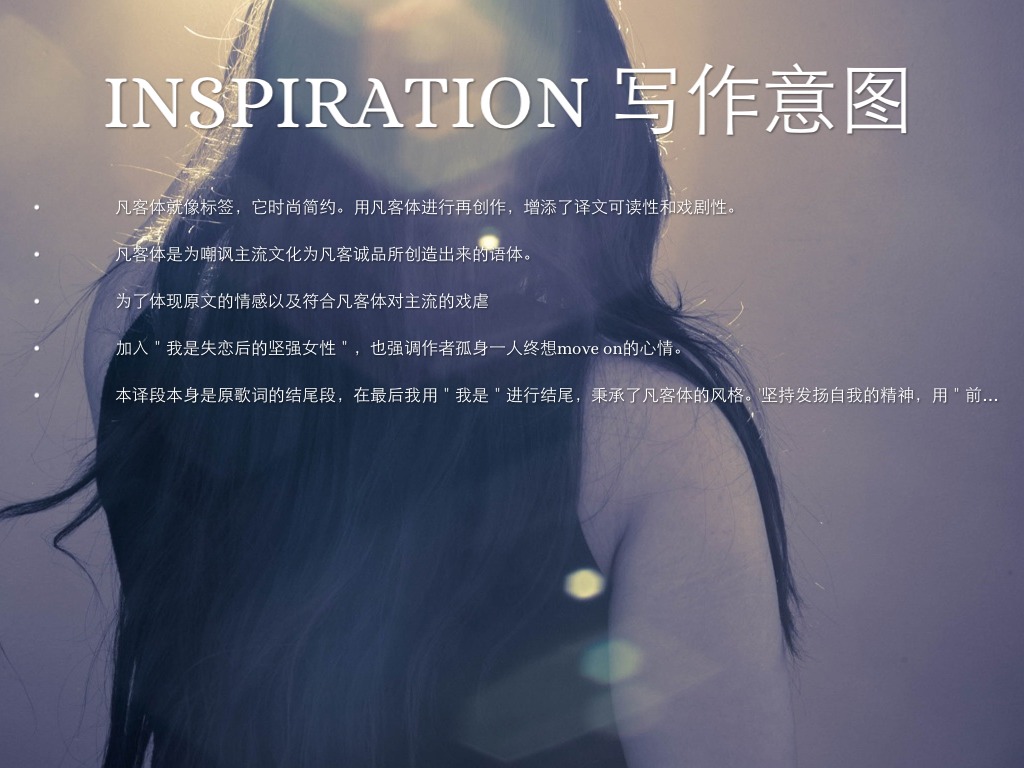 本译段本身是原歌词的结尾段,在最后我用"我是"进行结尾,秉承了凡客体的风格。坚持发扬自我的精神,用"前女友"一伤感的不正大的形容词,既清楚地界定了全文的定位(追忆、向前),又彰显了凡客对主流文化的讽刺。