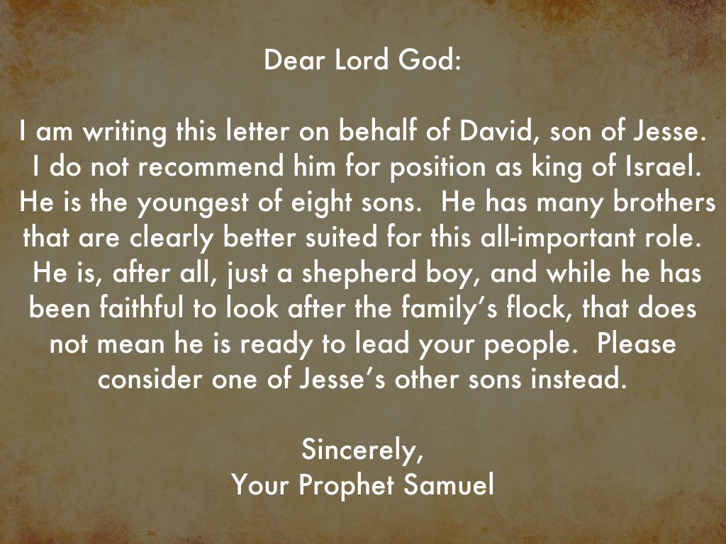 I am writing this letter on behalf of David, son of Jesse. I do not recommend him for position as king of Israel. He is the youngest of eight sons. He has many brothers that are clearly better suited for this all-important role. He is, after all, just a shepherd boy, and while he has been faithful to look after the family’s flock, that does not mean he is ready to lead your people. Please consider one of Jesse’s other sons instead.