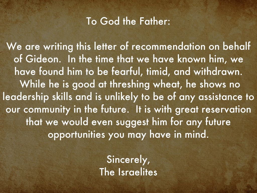 We are writing this letter of recommendation on behalf of Gideon. In the time that we have known him, we have found him to be fearful, timid, and withdrawn. While he is good at threshing wheat, he shows no leadership skills and is unlikely to be of any assistance to our community in the future. It is with great reservation that we would even suggest him for any future opportunities you may have in mind.