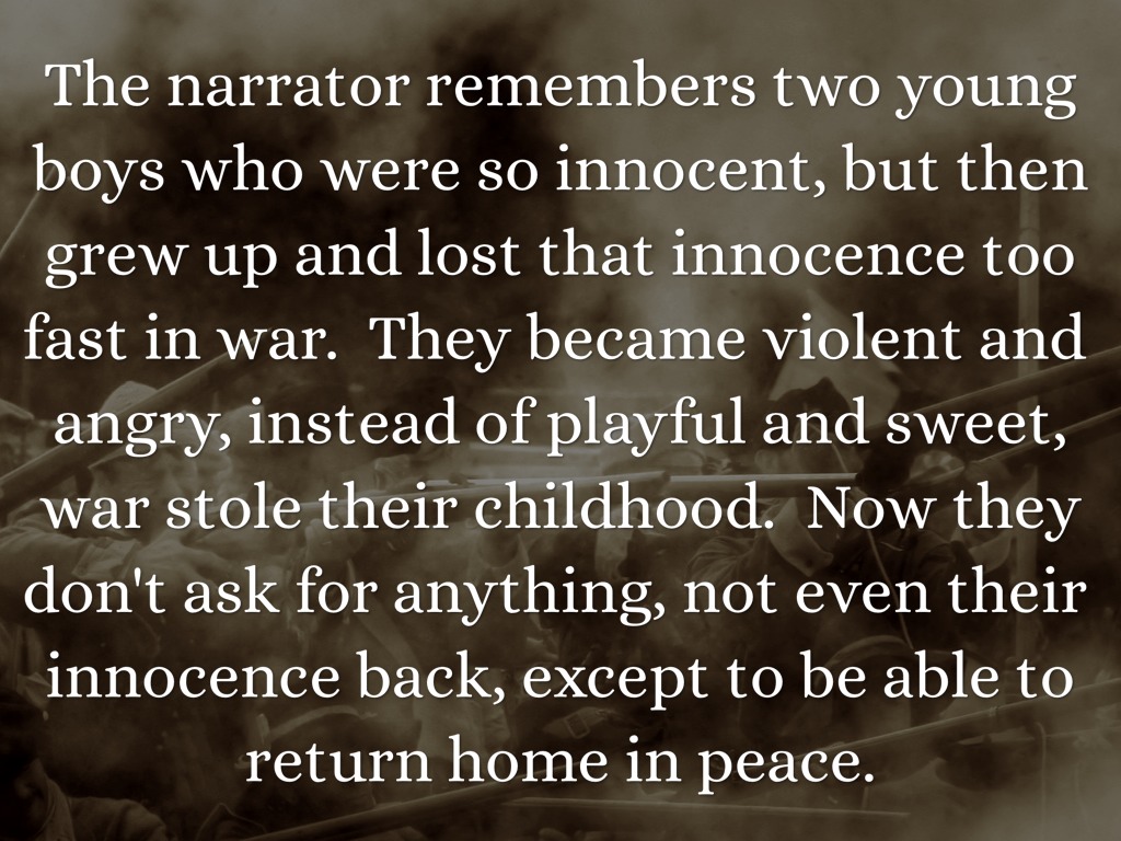The narrator remembers two young boys who were so innocent, but then grew up and lost that innocence too fast in war. They became violent and angry, instead of playful and sweet, war stole their childhood. Now they don't ask for anything, not even their innocence back, except to be able to return home in peace.