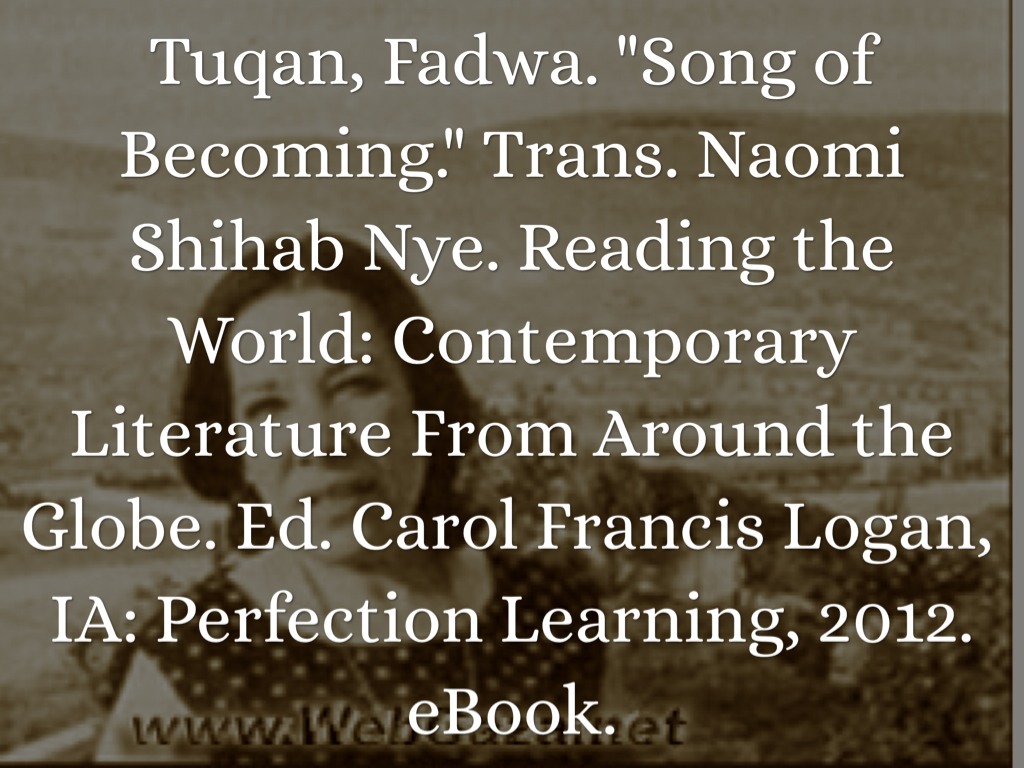 Tuqan, Fadwa. "Song of Becoming." Trans. Naomi Shihab Nye. Reading the World: Contemporary Literature From Around the Globe. Ed. Carol Francis Logan, IA: Perfection Learning, 2012. eBook.
