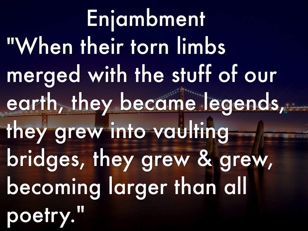 Enjambment "When their torn limbs merged with the stuff of our earth, they became legends, they grew into vaulting bridges, they grew & grew, becoming larger than all poetry."