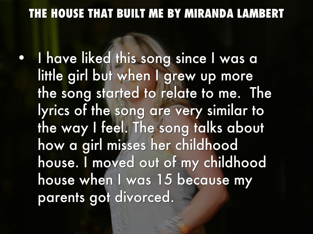 I have liked this song since I was a little girl but when I grew up more the song started to relate to me. The lyrics of the song are very similar to the way I feel. The song talks about how a girl misses her childhood house. I moved out of my childhood house when I was 15 because my parents got divorced.