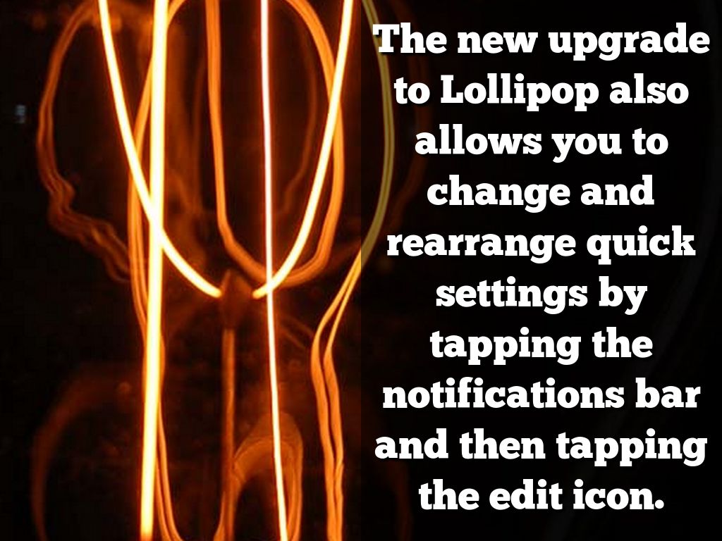The new upgrade to Lollipop also allows you to change and rearrange quick settings by tapping the notifications bar and then tapping the edit icon.
