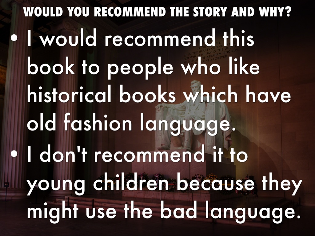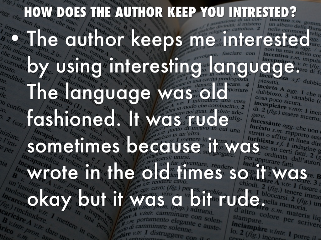 The author keeps me interested by using interesting language. The language was old fashioned. It was rude sometimes because it was wrote in the old times so it was okay but it was a bit rude.