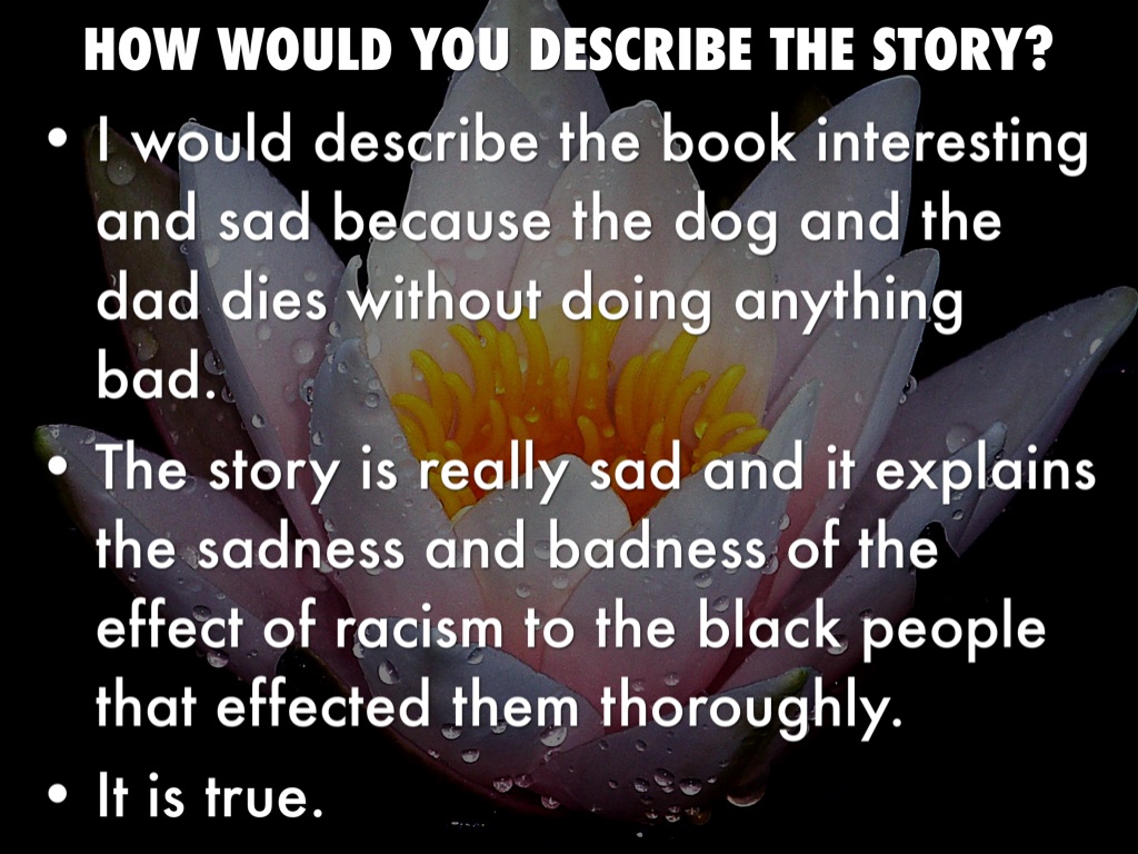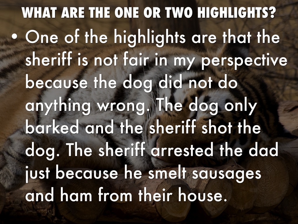 One of the highlights are that the sheriff is not fair in my perspective because the dog did not do anything wrong. The dog only barked and the sheriff shot the dog. The sheriff arrested the dad just because he smelt sausages and ham from their house.