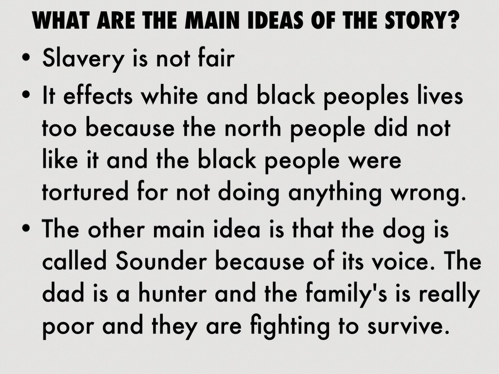 The other main idea is that the dog is called Sounder because of its voice. The dad is a hunter and the family's is really poor and they are fighting to survive.