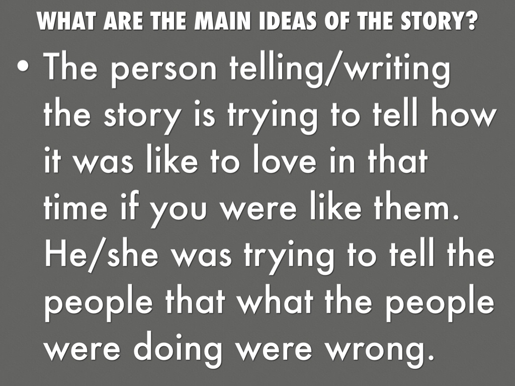 The person telling/writing the story is trying to tell how it was like to love in that time if you were like them. He/she was trying to tell the people that what the people were doing were wrong.