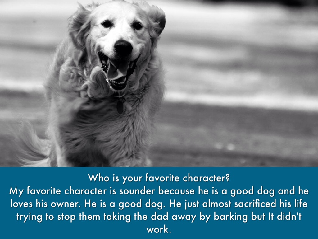 Who is your favorite character? My favorite character is sounder because he is a good dog and he loves his owner. He is a good dog. He just almost sacrificed his life trying to stop them taking the dad away by barking but It didn't work.