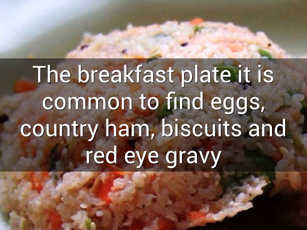 The breakfast plate it is common to find eggs, country ham, biscuits and red eye gravy