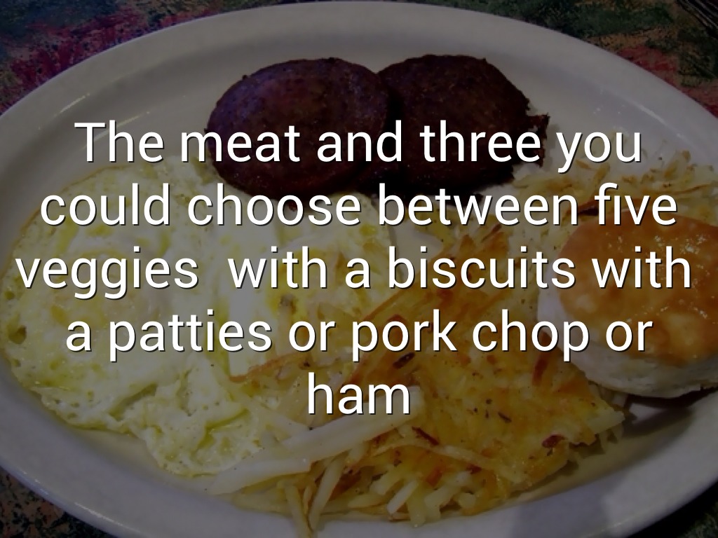 The meat and three you could choose between five veggies with a biscuits with a patties or pork chop or ham