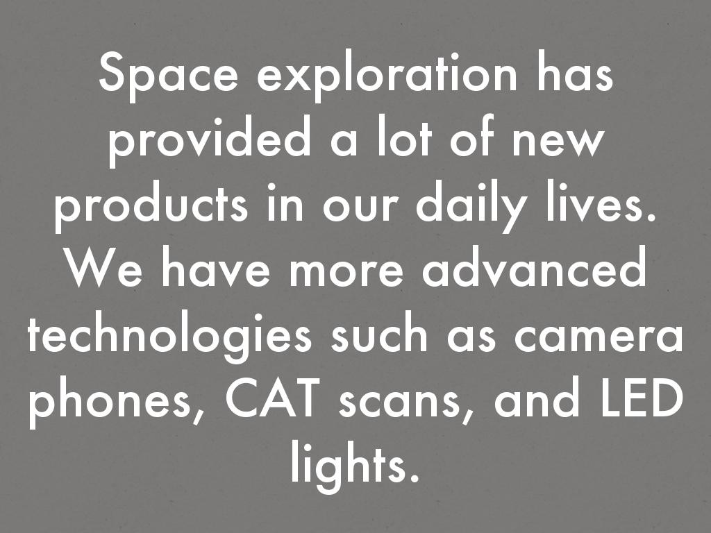 Space exploration has provided a lot of new products in our daily lives. We have more advanced technologies such as camera phones, CAT scans, and LED lights.