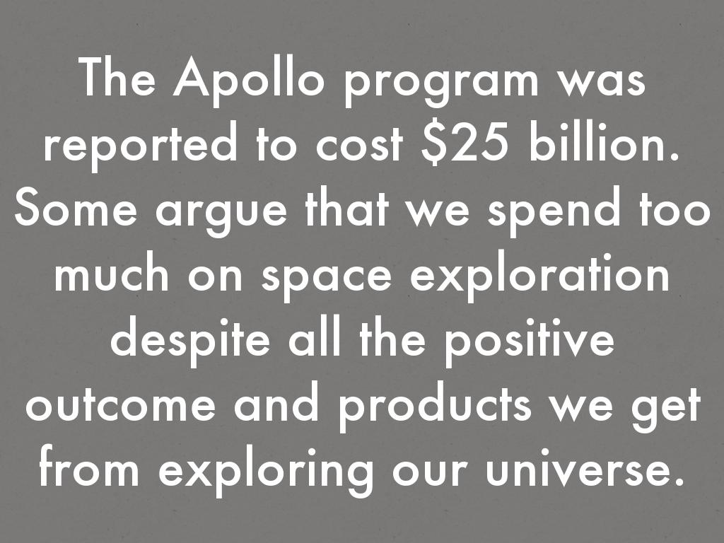 The Apollo program was reported to cost $25 billion. Some argue that we spend too much on space exploration despite all the positive outcome and products we get from exploring our universe.