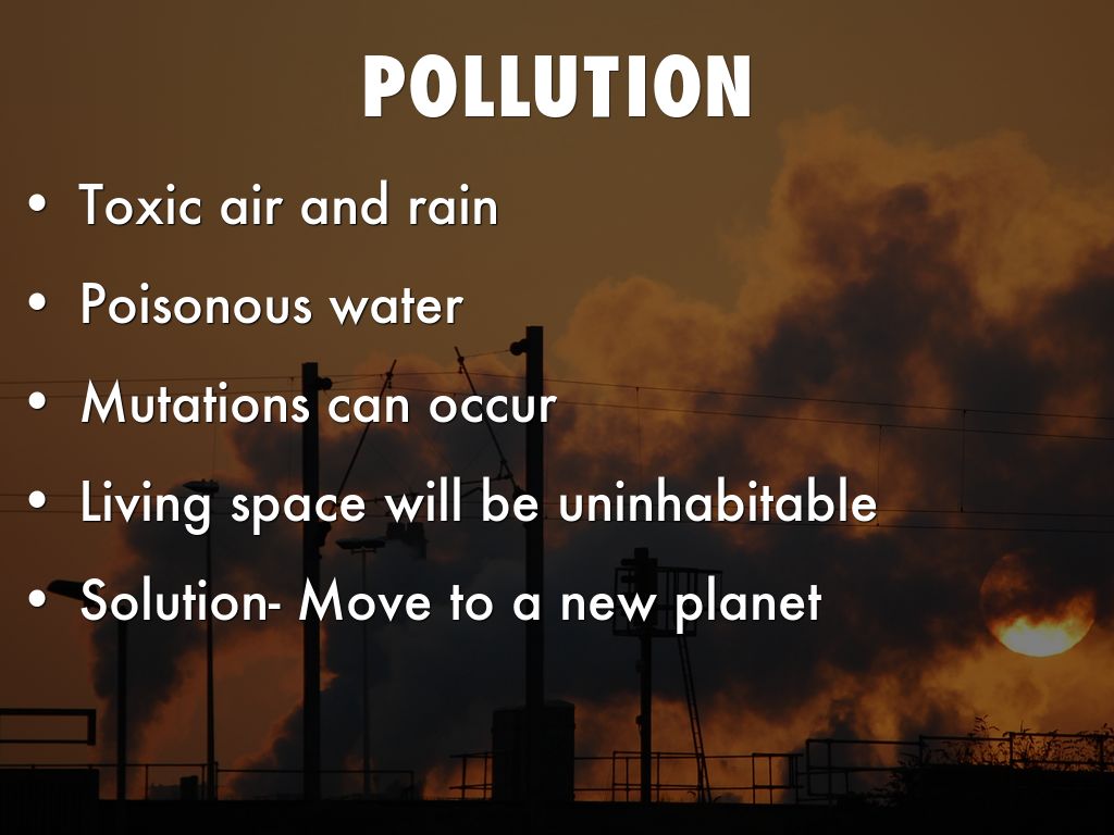 etcetera. It will get worse as time goes on. There are days when the air is moderate, good, bad for some people, and very bad. There are basic explanations for that in which are also self explanatory and obvious. As pollution worsens, the air will become toxic. Basically we will be living in a bubble of poison that kills us each day. Our current living land space will be uninhabitable. Organisms will be forced to move to higher ground away from the toxic fumes. Mutations can possibly occur and humans will no longer be the same. The solution, move to a new planet even though the same thing might happen there.