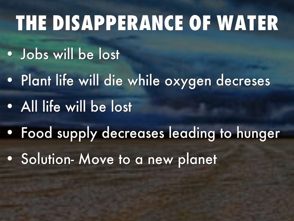 level has decreased. Each year it will decrease little by little, and eventually, all water on earth will be gone, or disappear. This is a terrible thing because our bodies, and other organism bodies, need water to survive. Even plants need water to live. Imagine a world without water and figure out the days you can go without drinking water before dieing. Plants die easily without water. If there was not any plants then the worlds oxygen would gradually be used up. The conclusion is self explanatory. No oxygen means there will be a slight choking moment at the end of your life.