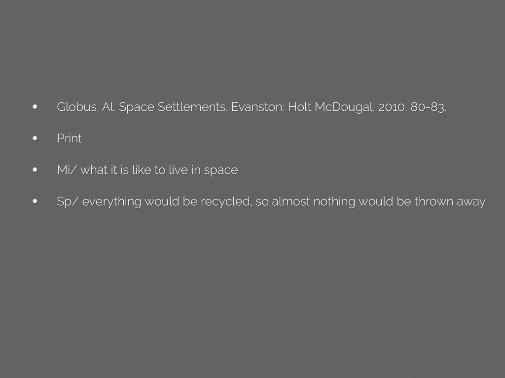 Globus, Al. Space Settlements. Evanston: Holt McDougal, 2010. 80-83.