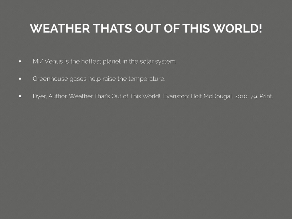 Dyer, Author. Weather That's Out of This World!. Evanston: Holt McDougal, 2010. 79. Print.