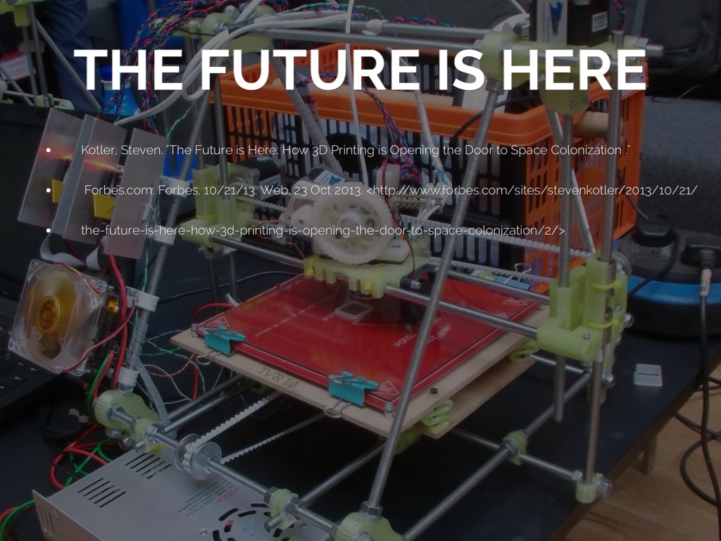 Kotler, Steven. "The Future is Here: How 3D Printing is Opening the Door to Space Colonization ."